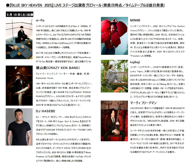 5月10日(土)は、メジャーデビュー25周年を越えた今もシーンのトップを走るm-flo、横山剣(CRAZY KEN BAND) とDJ HASEBEによるスペシャルコラボセット横山剣(CRAZY KEN BAND) +DJ HASEBE Special Collabo set、日本を代表するジャパレゲ女王のひとりMINMI、SNS発で話題を集めるシンガーソングライターkojikoji、元MEGADETHのギタリストで日本のテレビ番組でも人気のマーティ フリードマンの5組が出演します。