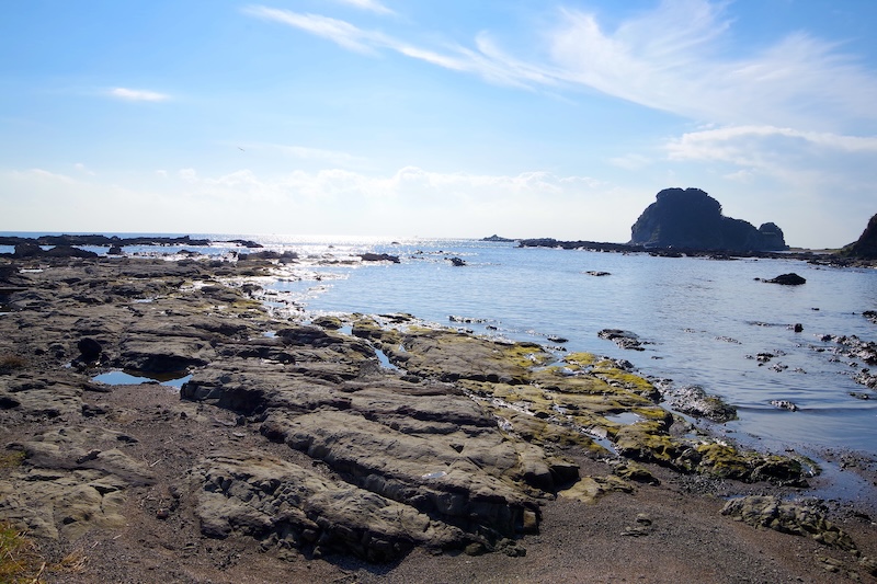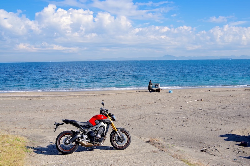 さて、有料の駐車場が続く三浦海岸を過ぎて隣りの菊名海岸に入ると無料駐車場が点在しているので、海辺で佇むならこちらがお勧め。そして江奈湾の干潟を過ぎて毘沙門天浜へと向かう。浜に道は続いているが、浜の前で崩れて泥路になっているので、手前にある白浜毘沙門天の前にバイクを止めて歩くのが◯だ。