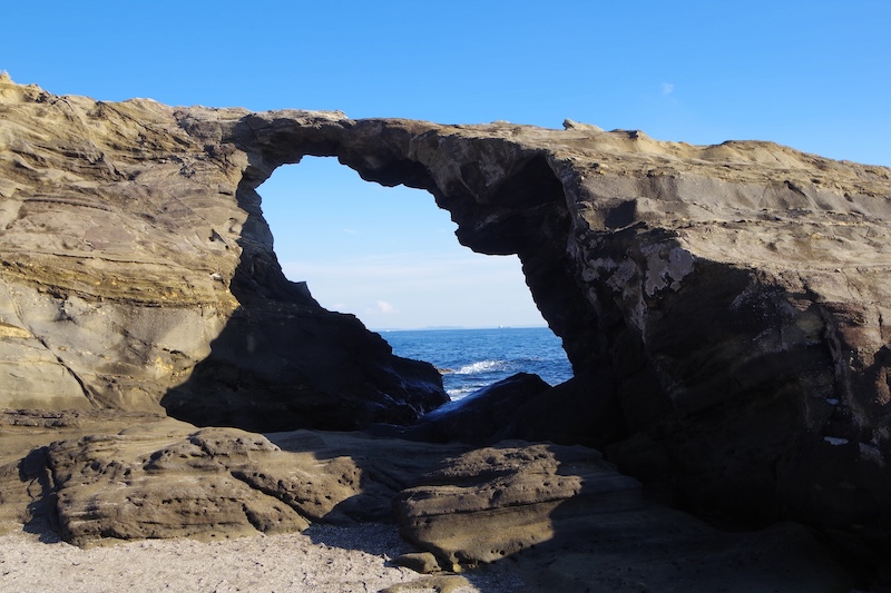 さて、無料となった城ヶ島大橋を渡り城ヶ島公園の第1駐車場に。ここで二輪駐車料金100円を払って駐車券をもらうと、島内の他公共駐車場は同駐車券を入口の機械に通せば入れるようになる。第1駐車場から名所の馬の背洞門までは整備された遊歩道を歩いて7、8分で到着できる。
