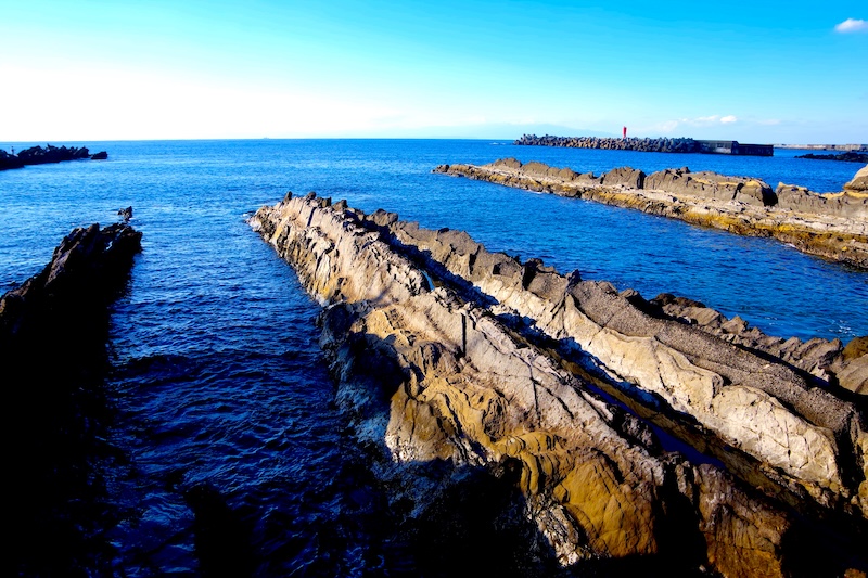 続いて島の西側に行き、二輪駐輪場のある第3駐車場に先程の駐車券を使って入りバイクを停めた。そこから歩いて城ヶ島灯台に向かうも工事中で灯台まで行けず。但し、赤い観光橋を渡った先にあ西崎の磯には行くことができた。西崎の磯はゴジラの背びれのような尖った岩礁地が並ぶ素晴らしい絶景ポイントだ。