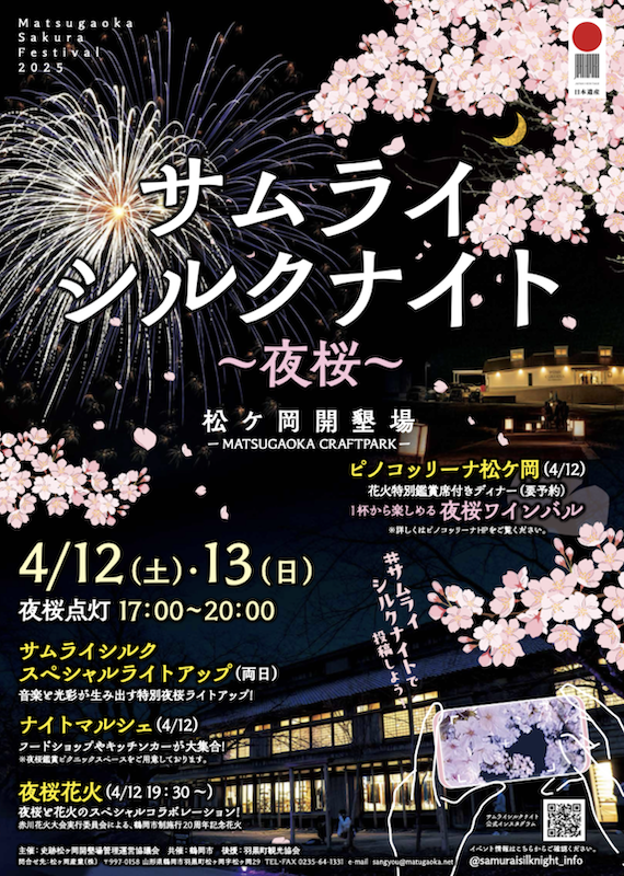 風情のある蚕室と大木の桜並木が彩る神秘的な空間を、ユネスコ食文化創造都市に認定された鶴岡の豊かな食や松ヶ岡産ワイン、夜空に咲く夜桜花火など様々なコンテンツと共にお楽しみください。