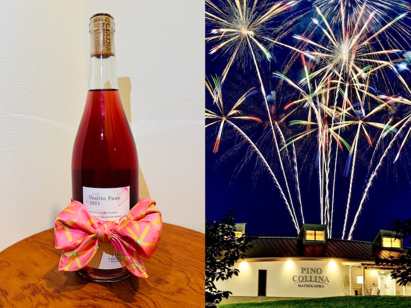 同エリアにあるワイナリー【ピノコッリーナ松ケ岡】では、夜桜イベントを記念して松ケ岡の桜をイメージしたロゼワイン「Vestito Fiore」(税込4950円)を新発売。グラス1杯から楽しめる夜桜ワインバル、花火鑑賞席確約付きの特別ディナー(要予約)を開催します。