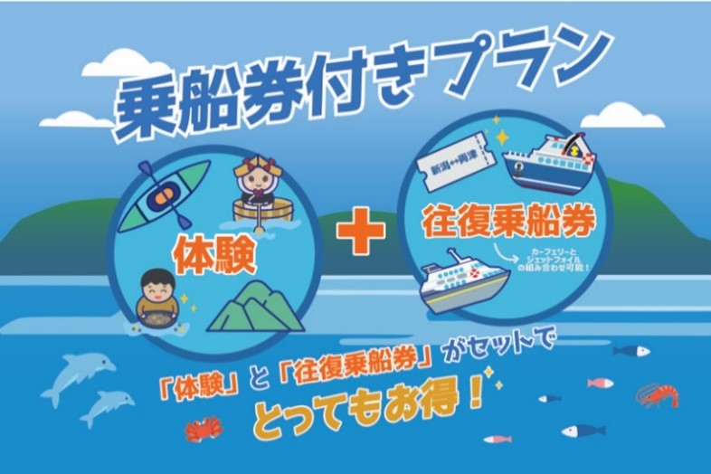 (一社)佐渡観光交流機構が運営する佐渡島の着地型体験予約サイト「サドベンチャー!」にて、企画乗船券「乗船券付きプラン」の販売を開始しました。(2024年に旧名称:「佐渡体験パック」から名称変更となりました。)