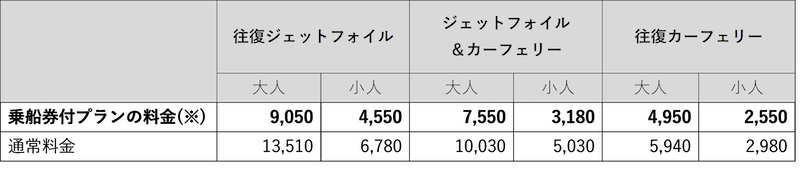 ジェットフォイル往復の場合、通常料金と比較し大人4,460円、小人2,230円(最大)も割引になります。