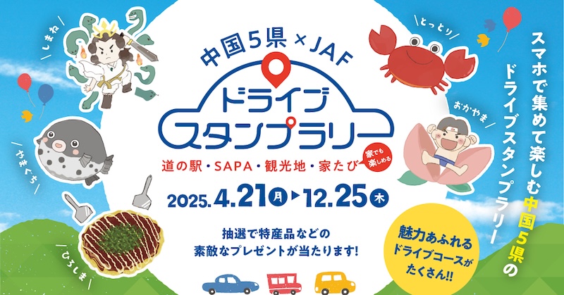 JAF(一般社団法人日本自動車連盟)中国本部は、4月21日(月)~12月25日(木)まで開催する、スマートフォン(以下、スマホ)を使用し、中国地方5県の観光地や道の駅、SAPAに設置された立ち寄りポイントでスタンプを集めてめぐる「中国5県×JAF ドライブスタンプラリー2025」を開催します。