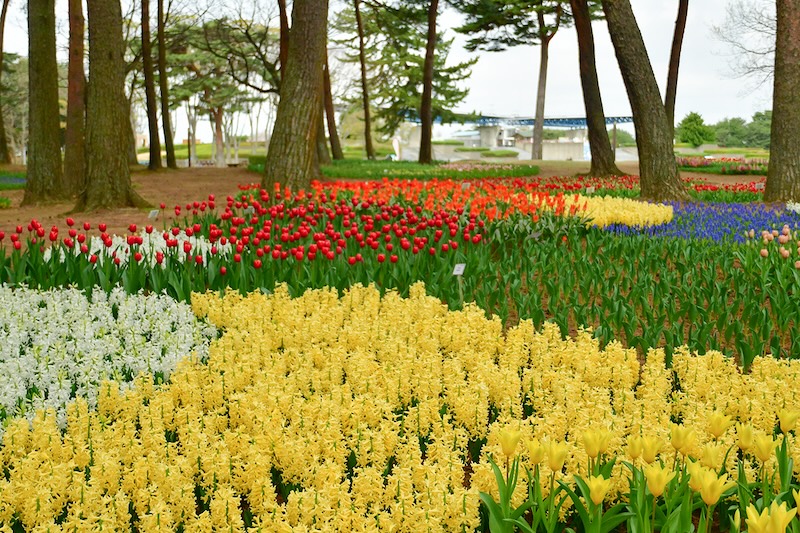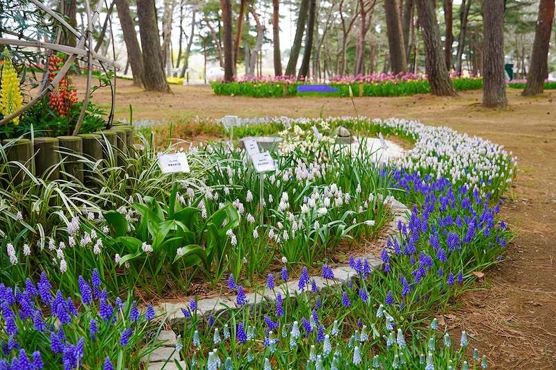 今年はチューリップの球数、品種数の増加だけではなく、ムスカリやヒヤシンスなど「春を代表する球根」をあわせて植栽することで、チューリップだけでは表現できない新たな『たまごの森フラワーガーデン』を創出するしています。また、「ムスカリの川」が流れる周辺は赤・白・黄といったチューリップらしい色味を多くは植栽しています。
