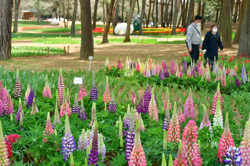 ルピナスは、藤の花を逆さにしたような縦長の花穂が特徴で、「昇り藤」とも呼ばれています。鮮やかな色合いと力強い立ち姿が、チューリップの柔らかなシルエットを引き立て、花畑に華やかさを作りだします。