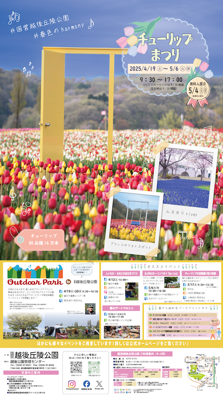 国営越後丘陵公園(新潟県長岡市)では、4月19日(土)~5月6日(火休)にチューリップまつりを開催します。
