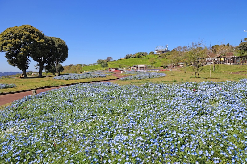 メインエリアの「花の谷」では、今週末から見頃に入り、ゴールデンウィークに満開を迎え、5月上旬までお楽しみいただける見込みです。100万本のネモフィラが一面を爽やかな青に彩る圧巻の花畑をぜひお楽しみに。