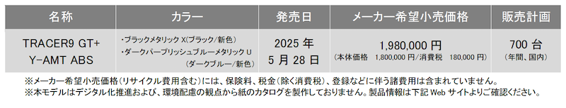 ヤマハ発動機販売株式会社は、“クロスプレーン・コンセプト※”に基づく直列3気筒888cm³エンジンを軽量アルミフレームに搭載した当社スポーツツーリングカテゴリーのフラッグシップモデル「TRACER9 GT+(トレーサーナイン ジーティープラス)」にライダーをサポートする新機能を搭載した2025年モデルとし「TRACER9 GT+ Y-AMT ABS」へ名称変更して5月28日に発売します。