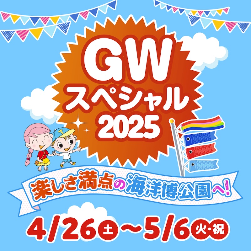 海洋博公園・沖縄美ら海水族館では、令和7年4月26日(土)~5月6日(火・祝)の期間中、みんなで楽しめる特別イベントを開催いたします。キャラクターショーに体験イベントなど、大人も子どもも一日中楽しめる内容となっております。