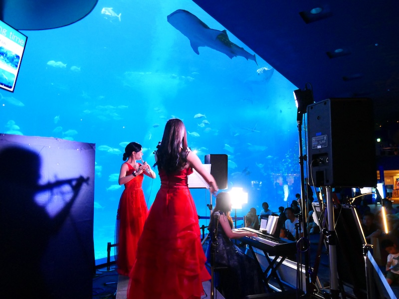 雄大な“青”が揺らぐ前で、音楽とともに過ごす特別な夜。飼育30年を迎えたジンベエザメ「ジンタ」が泳ぐ大水槽「黒潮の海」。バイオリンなどの美しい音色が響くナイトアンサンブルで、サンセットの余韻に浸りながら、優雅なひとときをお過ごしください。