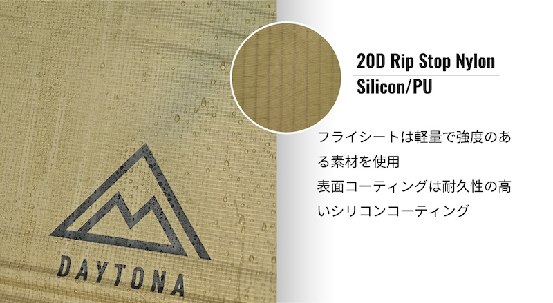 フライシートには軽量で強度のある素材を使用。(耐水圧3000mm)表面は耐久性の高いシリコンコーティング。アルミポールは強度が高く軽量なアルミ合金製です。