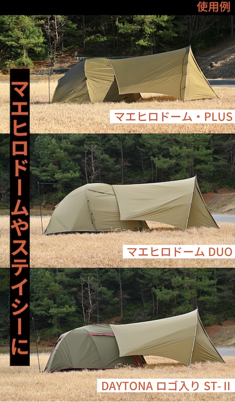 ご要望の多かったマエヒロドーム・PLUSやマエヒロドームDUOにご使用可能です。キャンパルジャパン製DAYTONAロゴ入りST-Ⅱ(ステイシーツー)にも装着できます。※現在在庫がなくなり次第、終売のマエヒロドーム(品番:37041,42912)とマエヒロドームAS(品番:42364,42911)にも接続可能です。