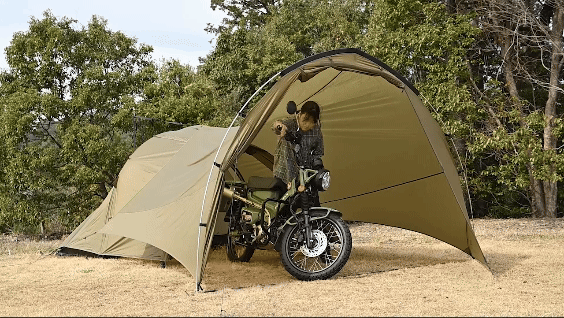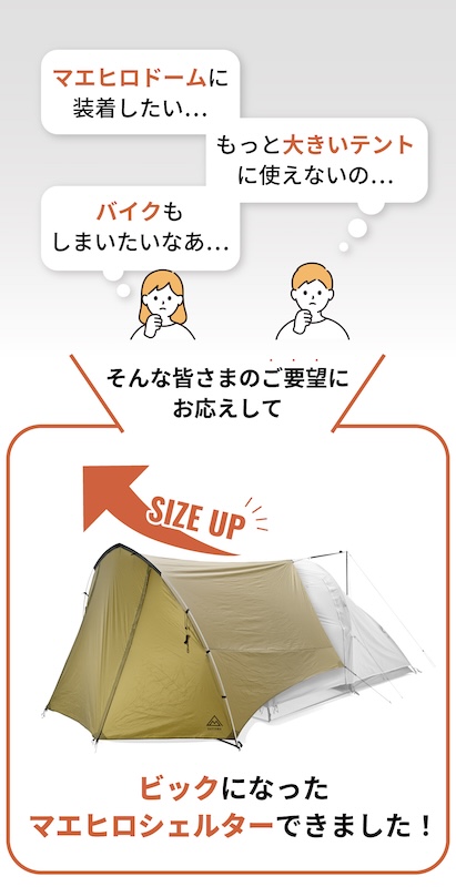 コンパクトなテントで室内空間が制約されてしまい不便な思いをされているライダー達にもっとキャンプを楽しんで欲しい!そんな思いから生まれたのが『マエヒロシェルター』です。