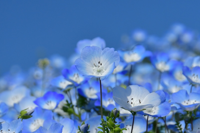ネモフィラはムラサキ科(旧ハゼリソウ科)ネモフィラ属で、北アメリカ原産の一年草。高さ10~20cmほどの株に、直径2~3cmの小さな青い花を咲かせます。