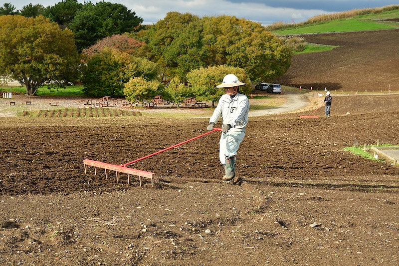 毎年きれいに咲かせるために、雑草除去や霜よけシートの設置をはじめ、多くの人の手によりこの風景を作り出しいています。