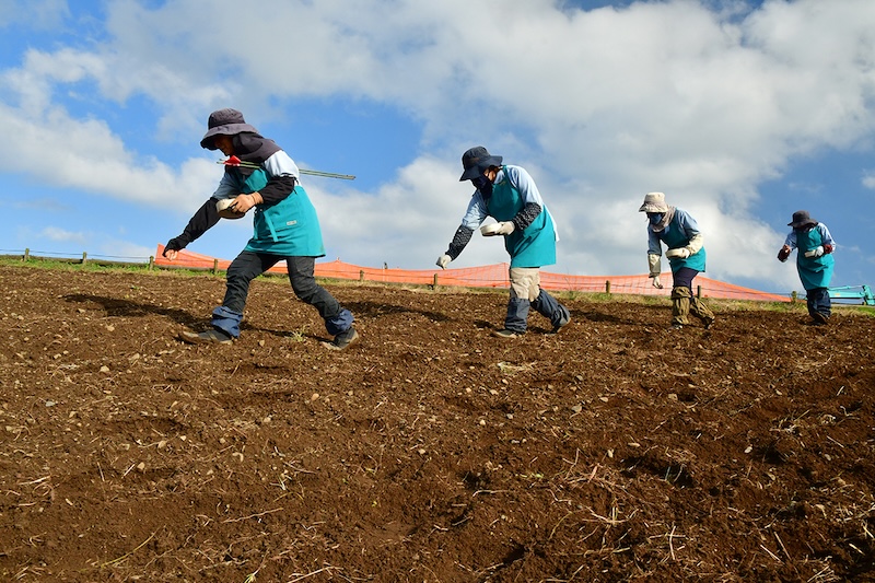 春にネモフィラを咲かせるための準備は、昨秋11月から始まりました。11月は、広大な「みはらしの丘」に約2週間、延べ80人による手作業で、1粒1mmほどの種130L分をまきました。10日~2週間ほどが経過して発芽を確認した12月には、根がしっかりと張るまでの間、冬の低温から株を守るための“霜よけシート”を設置。シートを外した後からは、ネモフィラの生育が雑草の成長に負けないよう、見頃を迎えた今現在も除草作業を行い景観を維持しています。