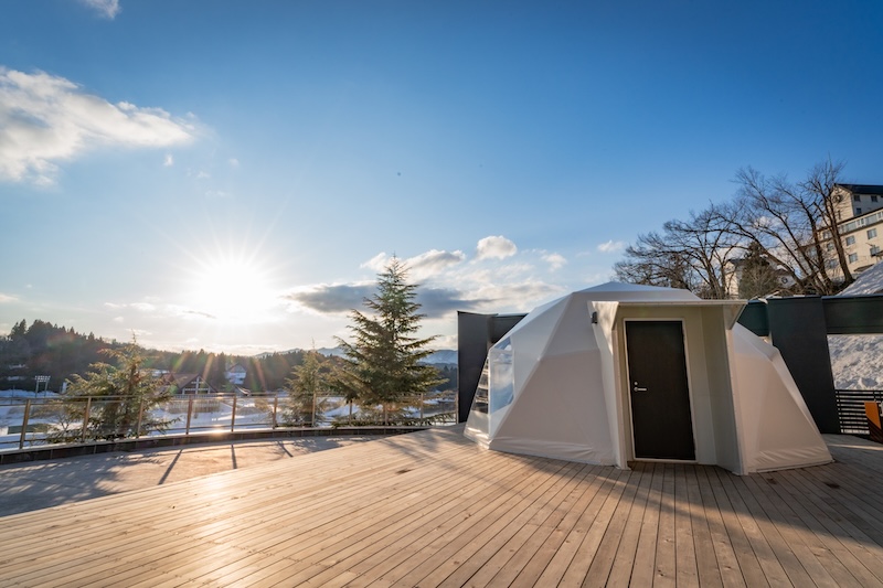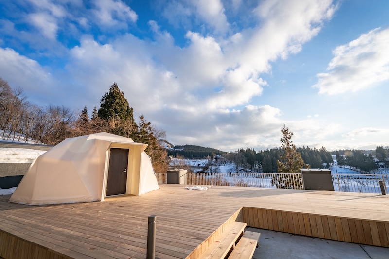 ウッドデッキの上に設置された2棟のドーム型テントは、まるで自然とひとつになったかのような開放感。