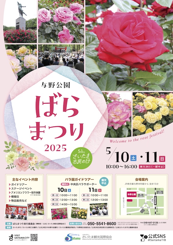 〈バラ園周辺〉ガイドツアー(無料、事前申込不要、雨天中止)〈中央広場〉ステージイベント(踊り、舞踊、和太鼓、演奏 など)〈南側広場〉消防及び警察車両展示(土曜のみ)、アメリカンフラワー制作体験(日曜のみ、5/7までの事前申込制、有料、定員あり)、模擬店(両日)、キッチンカー(日曜のみ)〈園内各所〉模擬店、展示会、バザー、物品販売など - 主催ばらまつり実行委員会(事務局:公益社団法人さいたま観光国際協会)