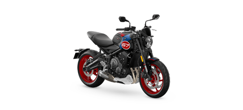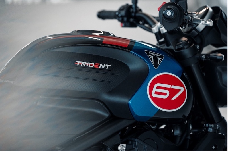 新しいスペシャルエディションは、レーシングバイクにインスパイアされた外観を継承し、マン島TTレースで5度の優勝を飾ったトライアンフの伝説的な「Slippery Sam」へのオマージュを捧げつつ、より現代的なグラフィックスキームを採用しています。なめらかなサファイアブラックのボディワークは、この特別版のベースとなる深みのある光沢のあるブラック仕上げを実現し、トライデント トリプル トリビュートに目立たない新しい外観をもたらします。タンク、テール、そしてフロントエンドを彩る大胆なコバルトブルーとディアブロレッドのハイライトとのコントラストが際立ちます。タンクにあしらわれた「67」のレースナンバーグラフィックは、トライデントの歴史上有名な大きな功績をスタイリッシュなオマージュしています。