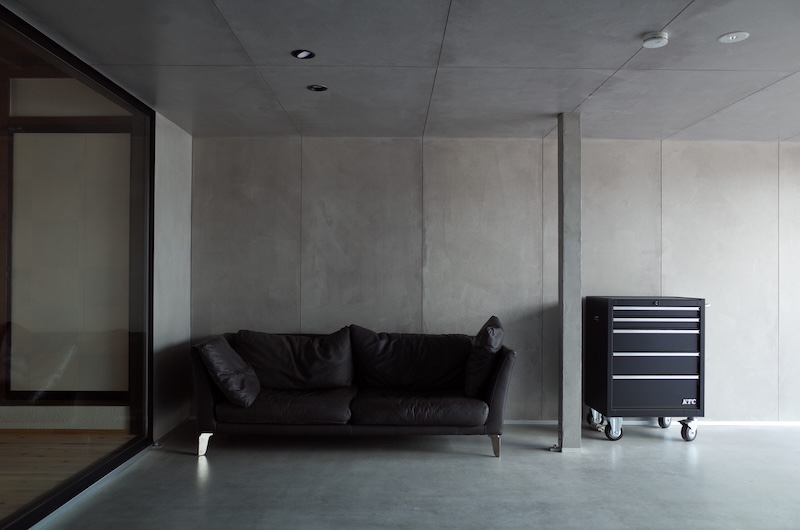 〈152INN〉最大の魅力は、バイクと共に過ごせる“秘密基地”のような非日常空間。一階には、愛車をガレージ越しに眺めながら食事や語らいを楽しめるダイニングを設置。床をあえて約10cm下げることで、着席時の目線とバイクの高さが合い、より深くバイクとつながれる演出となっています。