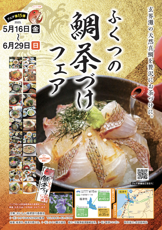 一般社団法人ひかりのみちDMO福津(福岡県福津市津屋崎3-17-3)は、福津市のご当地グルメ「鯛茶づけ」を満喫できる人気企画「ふくつの鯛茶づけフェア」を、今年も開催いたします。15回目を迎える今回も、「吾智網(ごちあみ)漁」の解禁時期(5月)に合わせてスタート。1~4月の禁漁期間を経て、水揚げされたばかりの玄界灘の天然真鯛を、福津のご当地グルメ「鯛茶づけ」で楽しめる特別な機会です。開催期間は全45日間。春から初夏にかけて、じっくりと味わっていただけます。