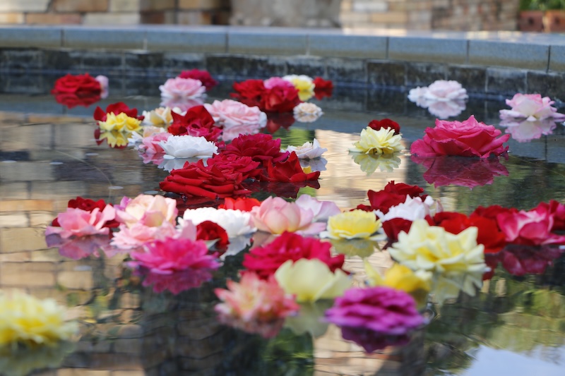 バラ園で摘んだ花を水盤に浮かべます。花手水のようでとってもフォトジェニック!