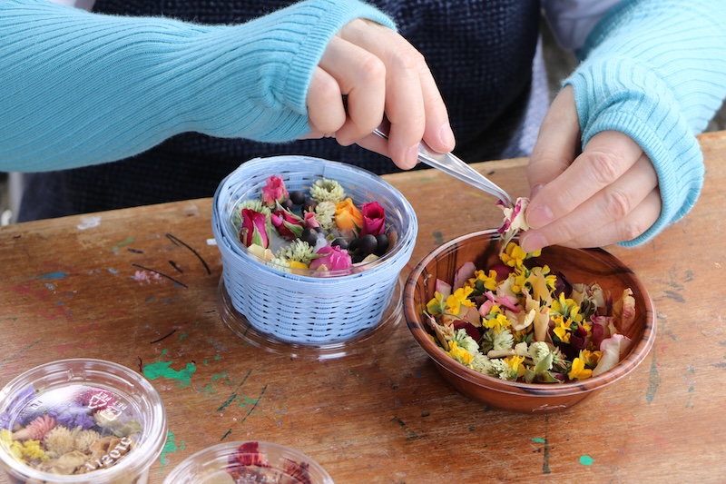 ボランティア特製のバラのドライフラワーを使用して作ります。プレゼントにも、お部屋に飾るのにもおすすめです。