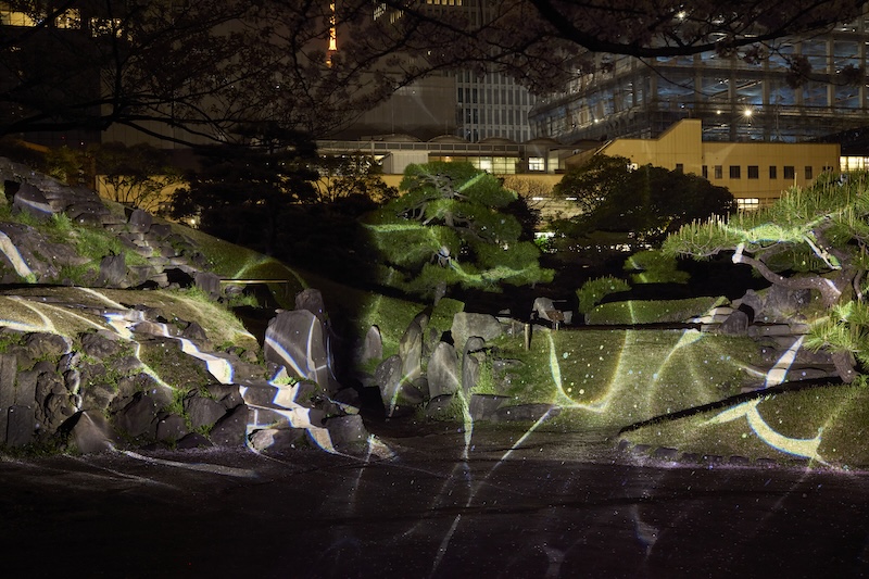 今年は、潮入りの池を中心に、庭園に古くから佇む景石や築山、灯籠などの造形に光と音を重ね、それぞれが持つ歴史や美しさを際立たせる演出を展開します。