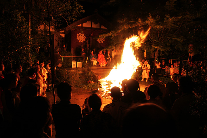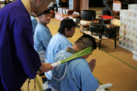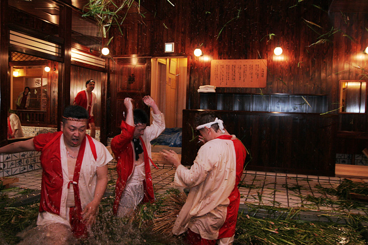 加賀温泉郷の中で、最も盛んに「菖蒲湯まつり」が行われている山代温泉。平安時代後期の僧・明覚によって建てられた「薬王院温泉寺」は、中世の頃に加賀・越前地方における密教の中心道場でした。その温泉寺に修験者が集まり、厄年にあたる若者の厄払いのために菖蒲を刈って、俵に詰め、無事息災を祈願したのがまつりの始まりとされています。菖蒲の詰まった俵を引きずり回して湯に投げ込み、その湯に浸かって邪気をはらったという勇壮な儀式は、現在でも「入湯式」の一場面として残っています。