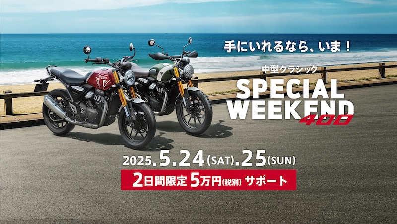 トライアンフモーターサイクルズジャパン株式会社は、全国のトライアンフ正規販売店にて、5月24日(土)~ 5月25日(日)までの2日間限定の「中型クラシック SPECIAL WEEKENDキャンペーン」を実施する事をお伝えします。