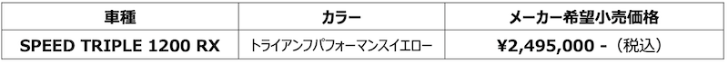 新型SPEED TRIPLE 1200 RXは全国のトライアンフ正規販売店にて、2025年6月中旬から販売開始の予定です。