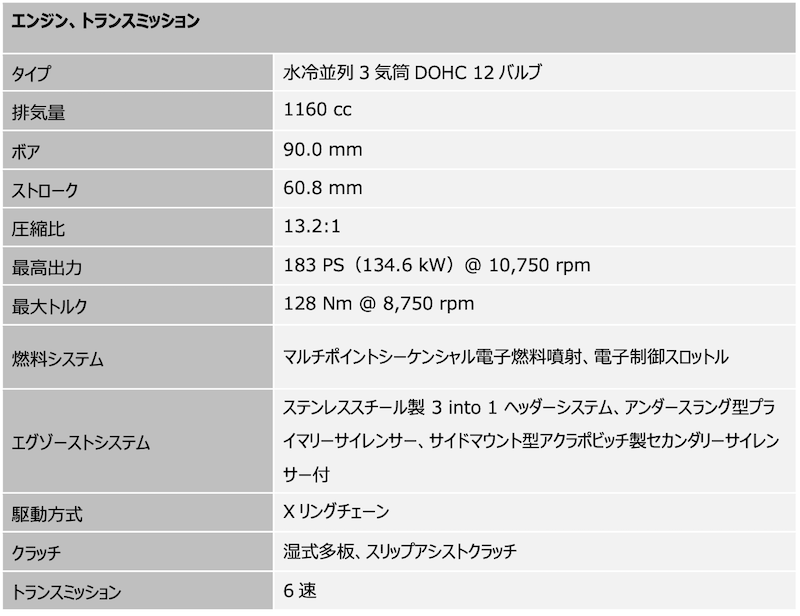 最高出力は183PS/10,750rpmで、先代スピードトリプルより3PS向上。トルクも向上し、128Nm/8,750rpmと、現行モデルより3Nm向上しただけでなく、回転域がわずかに低くなっています。