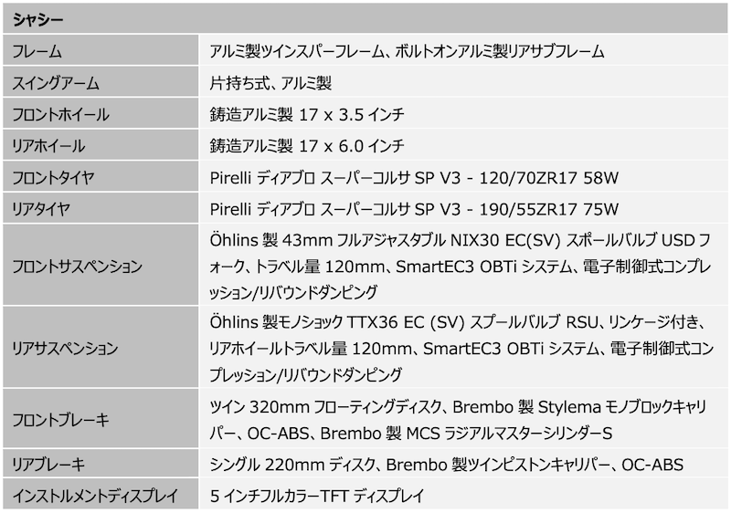 タイヤは、ピレリ製ディアブロ・スーパーコルサSP V3を装着。レーストラックでのパフォーマンスを発揮しつつ、公道でも安心したライディングフィールをもたらします。