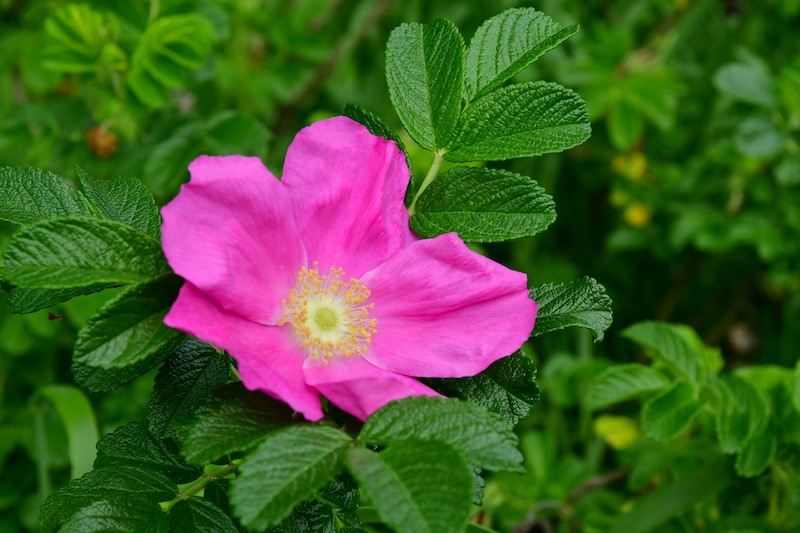 芳香のある一重で、ピンク色の花を咲かせます。トゲがびっしりとつく高さ、株張りともに1.5mほどにもなります。日本では北海道、茨城県より北の太平洋側や鳥取県より北の日本海側の海岸に自生しており、茨城県は「ハマナス」が自生する太平洋側の南限です。当公園では1,600株を植栽しています。