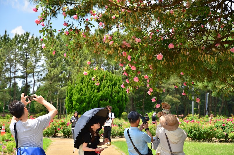 中国 雲南省の麗江路(リージャン・ロード)沿いで発見されたことに由来しています。鮮やかなピンクの花とつややかな濃緑の葉とのコントラストが美しく、見ごたえがあります。当公園では松の木に絡むように枝を伸ばし、緑の中にピンクの花が映える独特の景観をお楽しみいただけます。