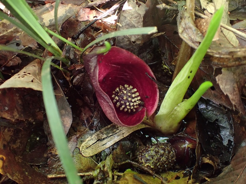 わずか4センチほどの赤紫色の仏炎苞をつけるヒメザゼンソウは、まるで森に隠された宝石のような存在です。落ち葉に埋もれひっそりと咲く姿は、訪れる人にとって幻の花を探すような体験をもたらします。大谷戸湿地入口の林縁という限られた場所で、園路柵沿いの数株のみが観察可能です。