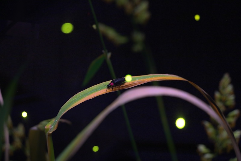 夜の原風景を再現した真っ暗な空間に設置された水槽の中に、これまでの飼育技術を生かして1年をかけて卵から育てたゲンジボタルとヘイケボタルの2種類を常時約50匹展示します。