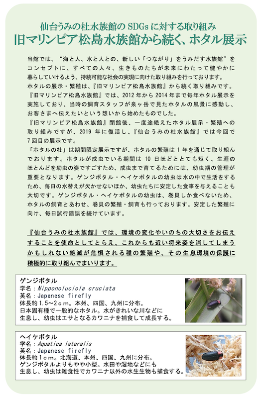 また、ホタルの生態や繁殖への取り組みについて学べる解説パネルも展示いたします。