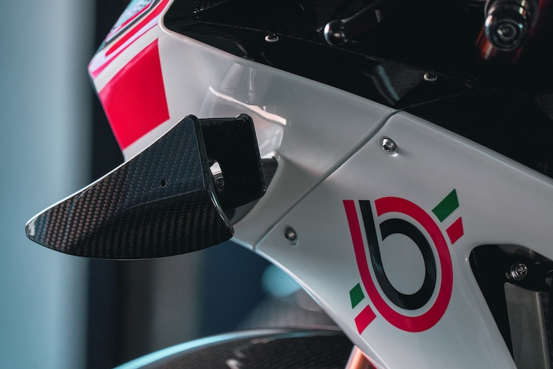 bimotaの職人がその手で仕上げた、美しい塗装を施されたカーボンファイバー製フェアリングには、近年のレーストレンドである、ダウンフォースを得るためのウイングレットを装備。専用のECUが車両速度とブレーキ作動を監視し、ケーブルとサーボモーターを介してウイングレットを自動的に調整。ブレーキングやコーナー進入、中間コーナーで最適なダウンフォースを発揮し、ホイールリフト抑制などの効果をもたらします。