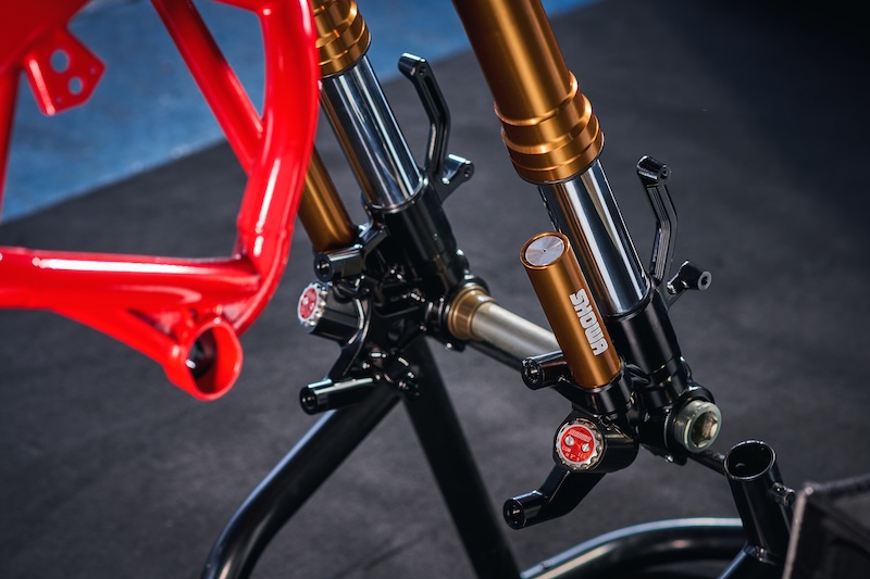 サスペンションはShowa製ø43mmBFFフロントフォークと、BFRC liteリヤショックを備え、リヤショックは垂直に配置することで、理想的な路面追従性を実現。上部のエキセントリックシャフトにより15mm上下に調整が可能となっています。
