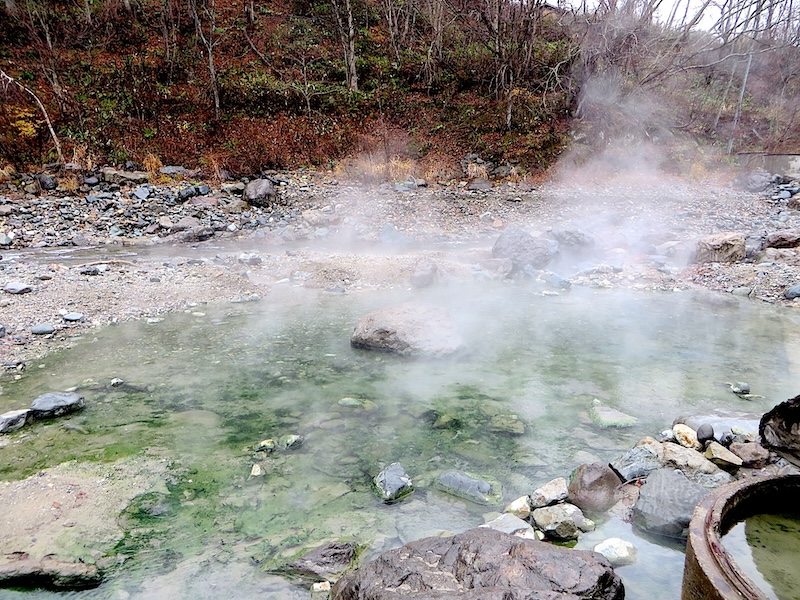 天池から戻り、鳥甲山の景観を望みながら再び国道405号線を南下。やがて酷道になり、秋山郷の最奥部の切明温泉に到着。切明温泉の雄川閣では日帰り入浴(内湯 700円)ができるほか、スコップ(300円)を借りて自分で河原に露天風呂を作って浸かることができる(水着着用可)。
