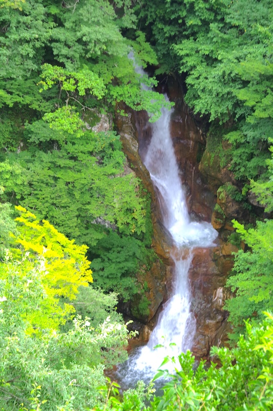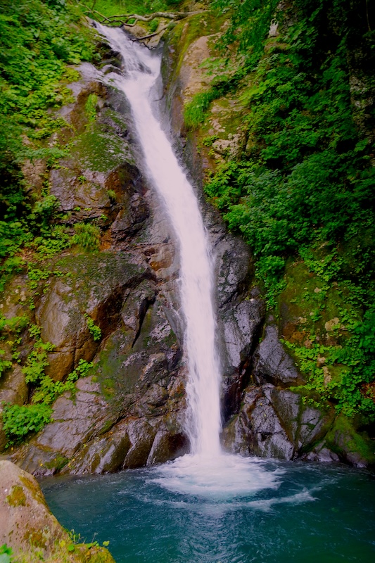 さて、切明温泉からの帰路は国道側ではなく和山集落の方から戻ったが、国道側に比べて道が良いのと鳥甲山の景観が望めるので、行き帰り共にこちらの道を通るのがお勧めだ。その後、大赤沢集落の山源木工二階の食事処で地元の山菜を使った天ざる蕎麦を食し、そのまま裏手にある蛇淵の滝を見に行った。