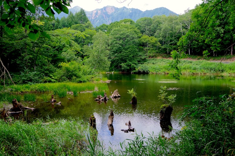 再び国道405号線に戻って3㎞ほど南下し、天池に向かう道を左折。1・5㎞ほど走ると天池に到着する。好天時には水面に標高2037mの鳥甲山の荒々しい景観が映る絶景を見れる秋山郷を代表する景勝地のひとつだ。