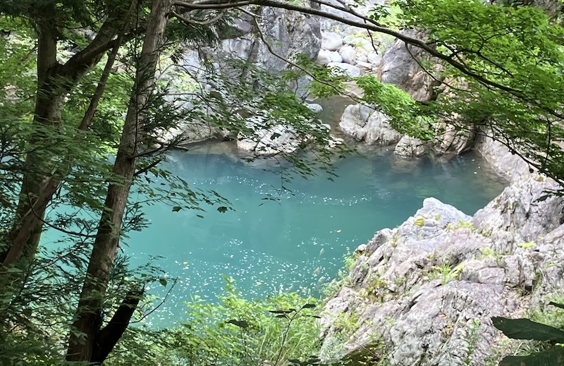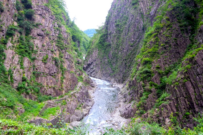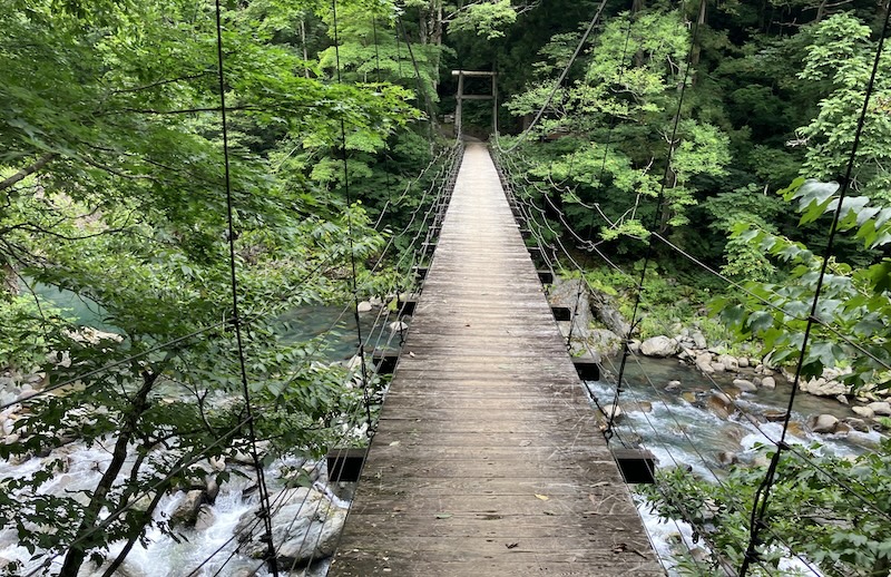 やがて、新潟の橋50選に選ばれている吊り橋の見倉橋に到着。橋は結構揺れるが、橋下のエメラルドグリーンの中津川渓谷がとても綺麗に見えるので意を決して渡ることをお勧めしたい。