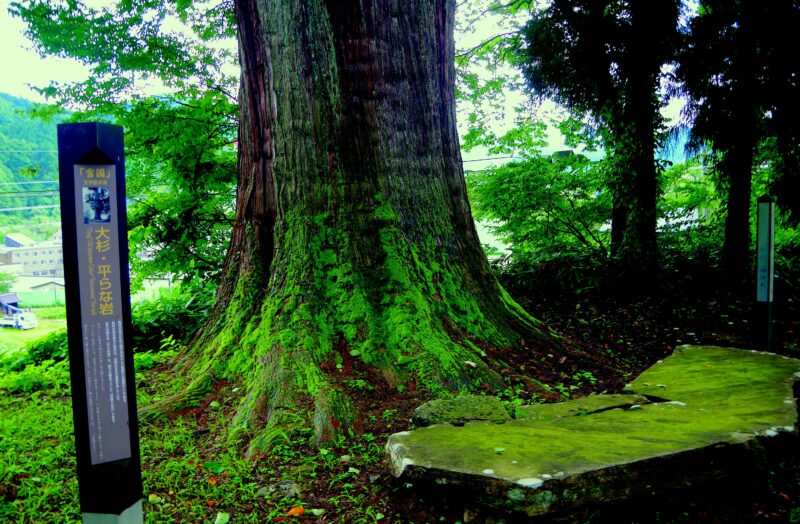 「苔のついた狛犬の…」と書かれ駒子が腰を下ろした諏訪社境内にあります平らな岩。