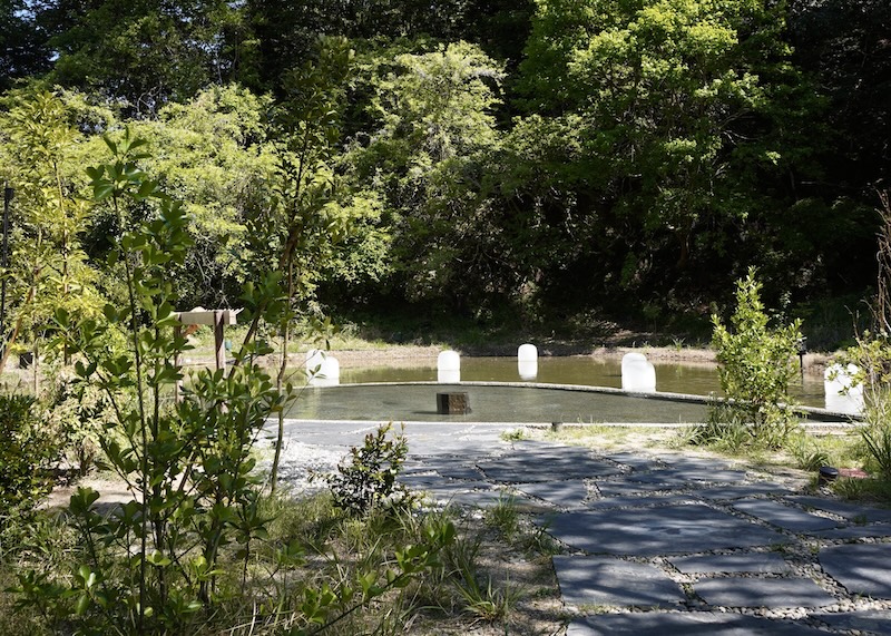 静けさに包まれた外湯から見える入浴者を包み込むように存在する木々、棚田跡に浮かぶランプ達は、水面に幻想的な情景を映し出します。