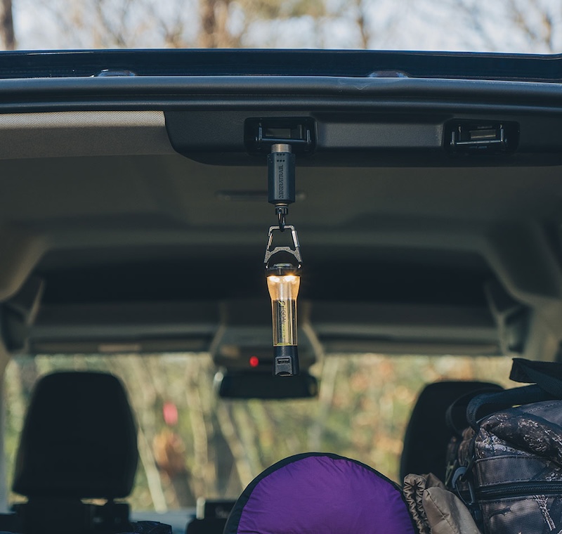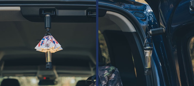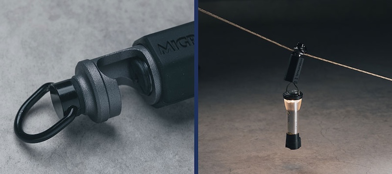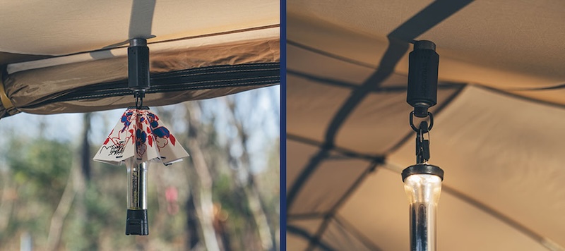 収納式フック – シリコンカバーをスライドさせるだけで、フックが簡単に使用可能。ランタンハンガー&ガイロープ対応:小型ランタンハンガーやガイロープに取り付けられ、マグネット部分にはワンタッチでLEDランタンを装着できます。
