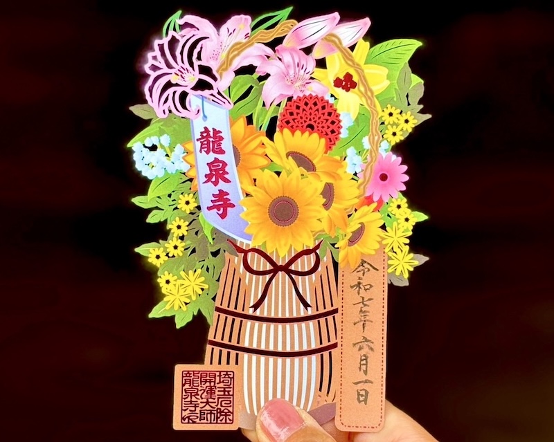 それらの花々を受け止める竹籠の花器は、自然のぬくもりと涼やかさを感じさせ、全体にやさしい調和をもたらしています。繊細にかたどられた切り絵は、彩り豊かで見た目にも涼やかで、ぜひこの御朱印を手に取り、花々に包まれた穏やかな夏のひとときをお楽しみください。